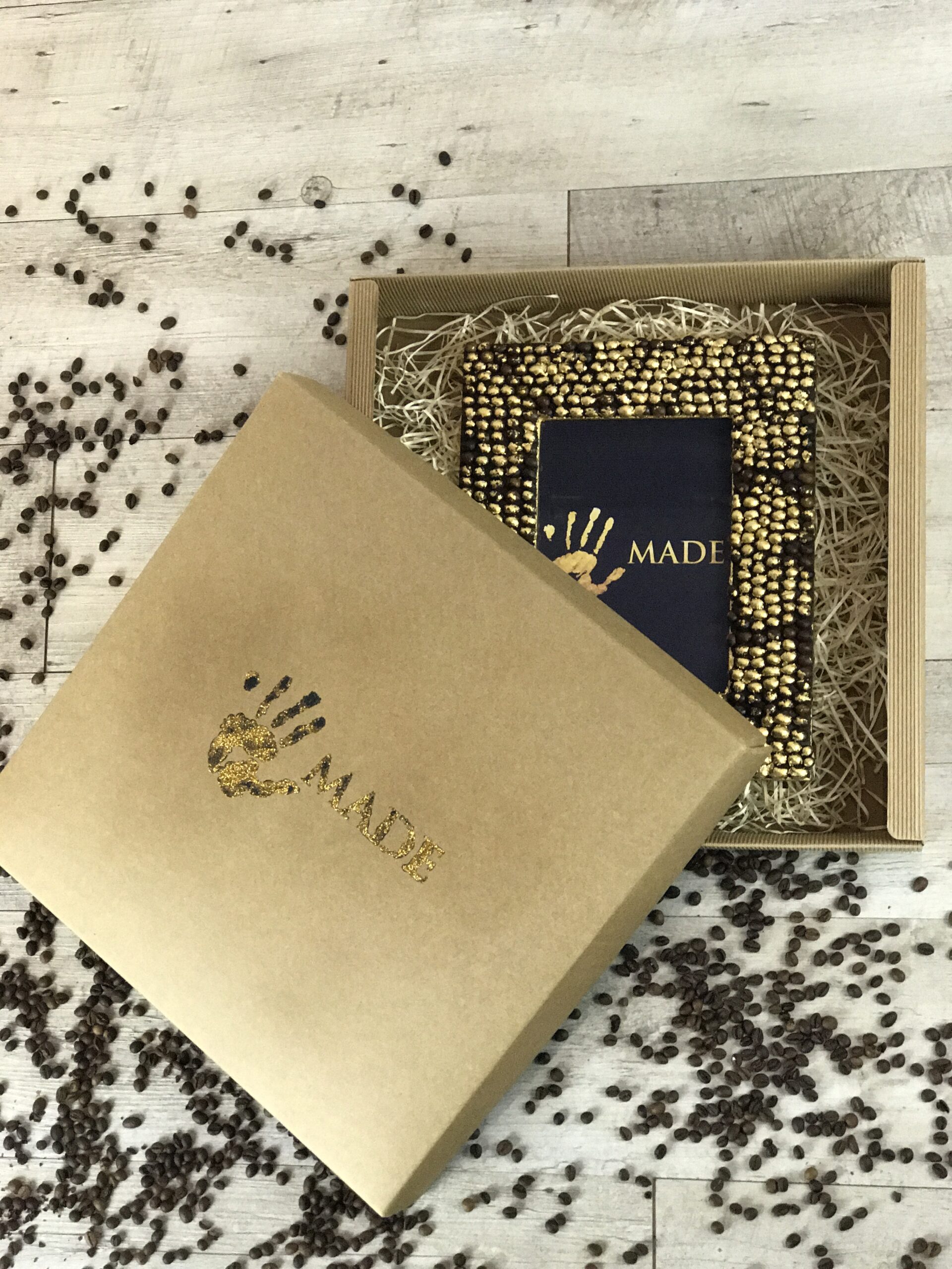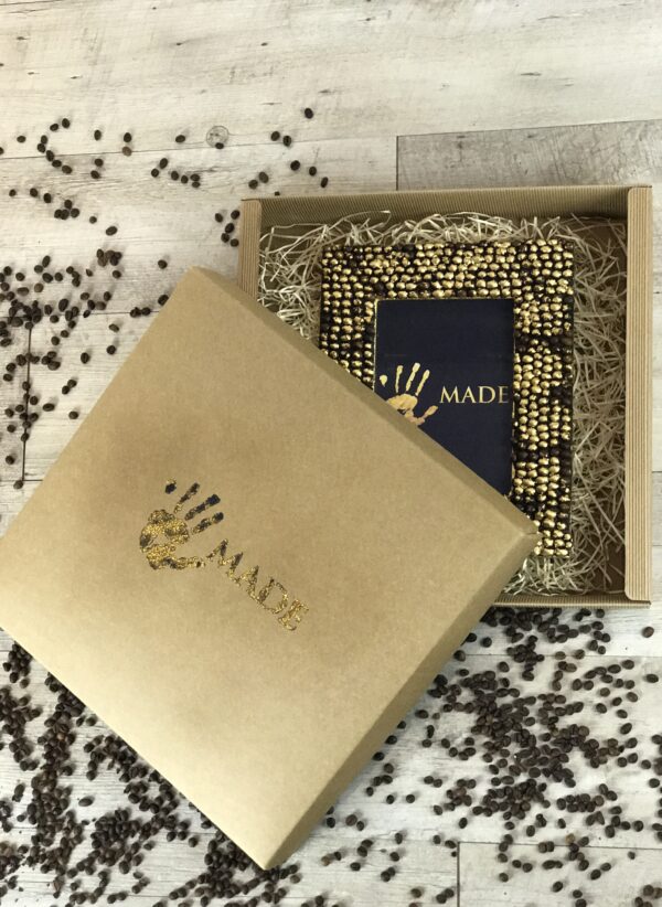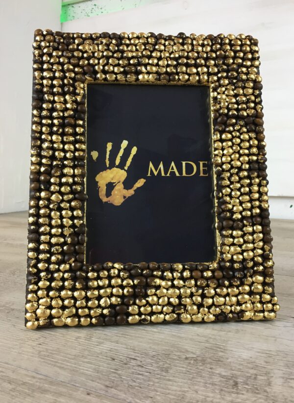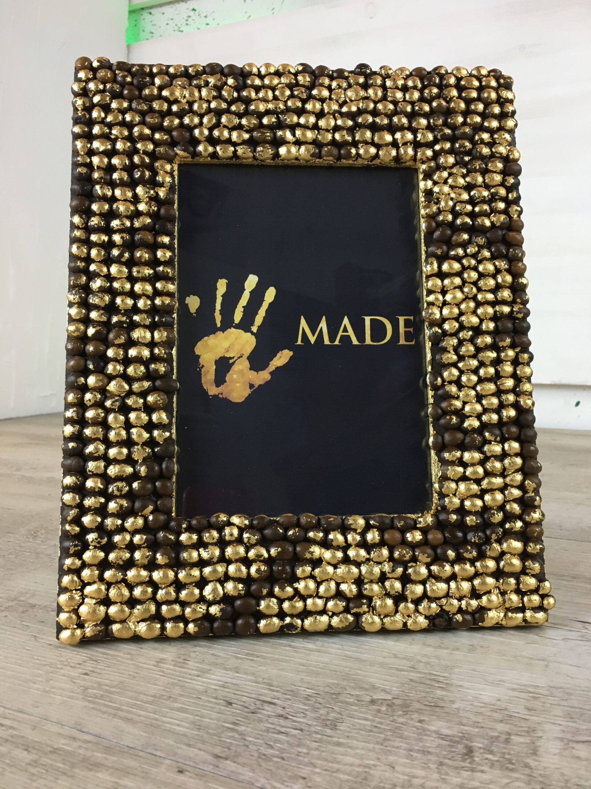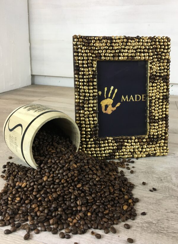 Portafoto in legno lavorato con chicchi di caffè incollati a mano uno a uno e decorato con foglia oro.
